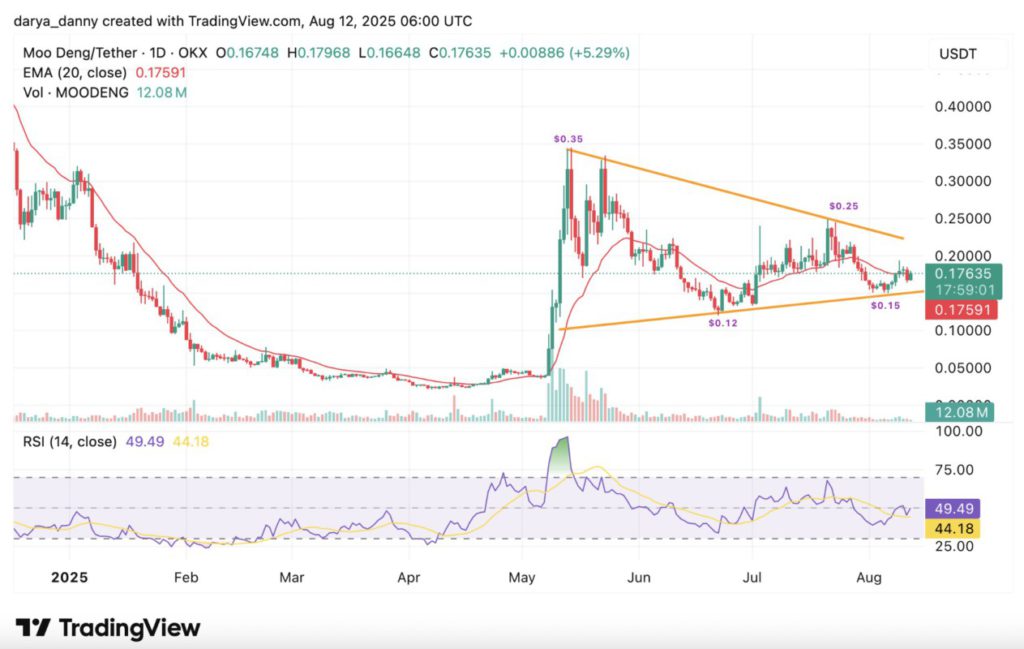 As of August 12, MOODENG’s price was hovering around $0.18, slightly below the 20-day EMA, with an RSI reading of around 49 – indicating neutral momentum and a balanced tug-of-war between bulls and bears.