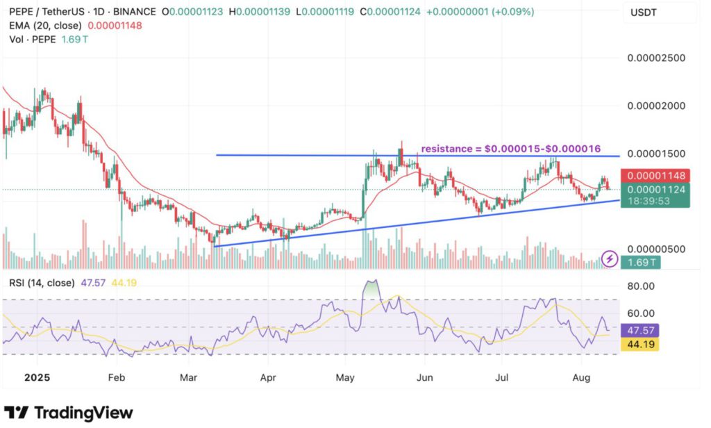On August 12, PEPE briefly traded at $0.00001148, right at the 20-day EMA, while consolidating after a failed attempt to break the triangle top in late July.