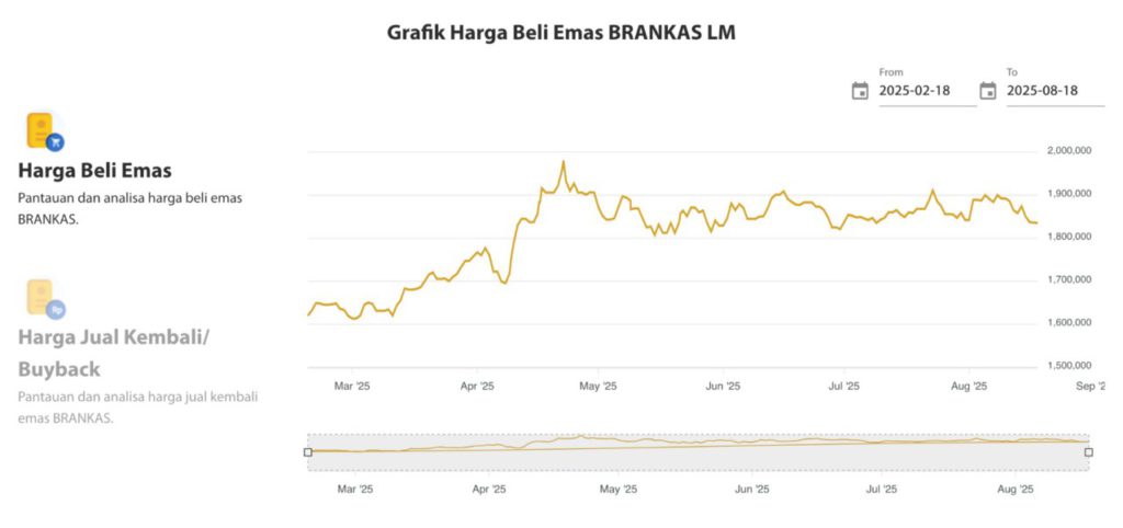 Based on the price chart from BRANKAS, gold price movements since February 2025 show an interesting pattern. Gold experienced a sharp spike in April and May 2025, breaking the Rp1,950,000 per gram range. This increase was driven by global geopolitical concerns and high inflation in several major countries.