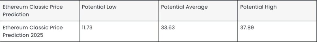 According to Cryptopolitan’s analysis, the ETC price is predicted to move between $11.73 (IDR189,656) as the lowest level, and $37.89 (IDR612,663) as the highest target in 2025. The average price is estimated at $33.63 ($543,877).