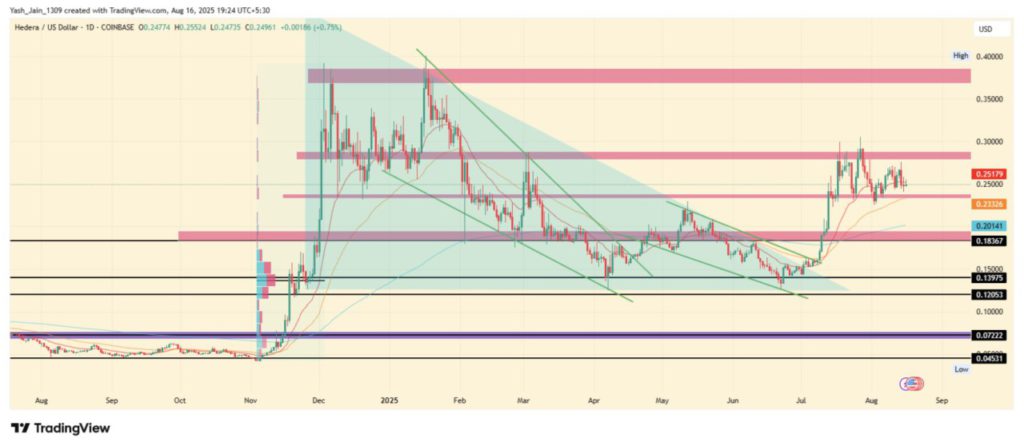 Hedera (HBAR) is ranked 17th with a market capitalization of around IDR171.5 trillion ($10.6 billion) and a price of IDR4,046 ($0.25). The asset had formed a descending triangle pattern that was successfully broken in July, before August brought a pullback phase. This situation opens up the possibility that HBAR is preparing to resume its upward trend.