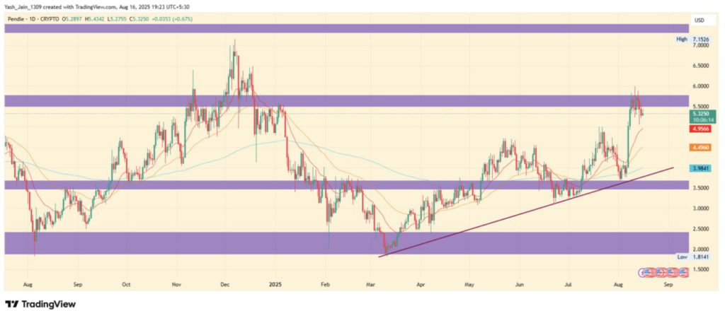 Pendle (PENDLE) is currently ranked 86 on CoinMarketCap with a market capitalization of IDR14.6 trillion ($900 million) and a price of IDR87,108 ($5.38). Over the past six months, PENDLE’s price has consistently moved along an upward trend line. In August, a new rally pushed the price up to IDR97,116 ($6), a level last reached in December 2024.