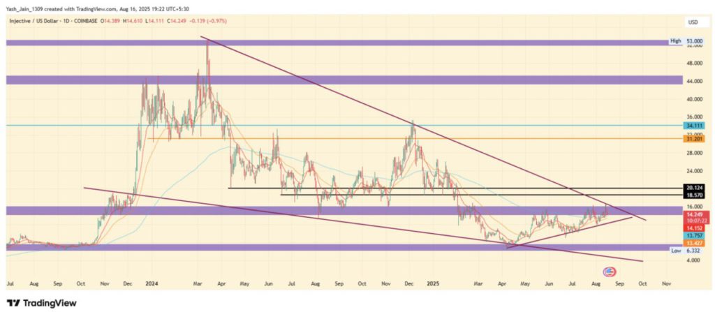 Injective (INJ) is currently ranked 64th with a market capitalization of IDR 22.7 trillion ($1.4 billion) and a price of IDR 226,604 ($14). INJ’s price pattern is forming a falling wedge that has been ongoing for the past two years. By 2025, INJ follows a long-term uptrend although it is still stuck in the supply area around IDR258,976 ($16).