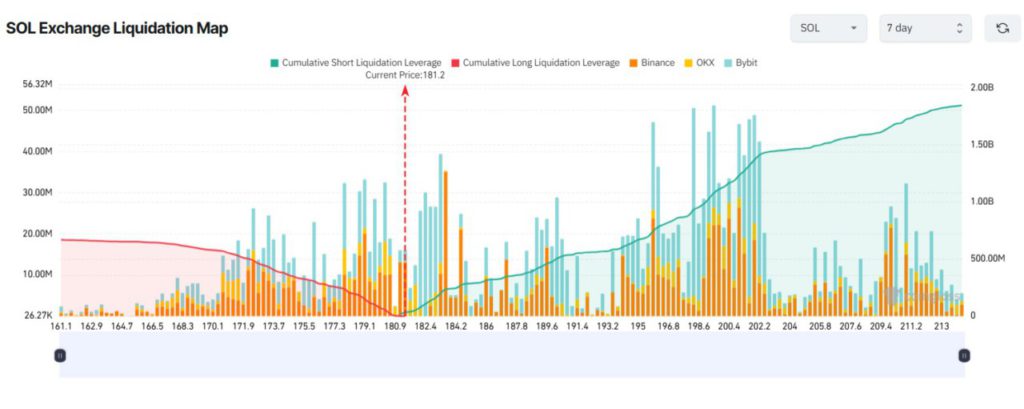 Analysts warn of a more worrying scenario, where Solana (SOL) could fall below $170 before bouncing back above $200 within the same week. This suggests that both long and short traders could potentially face liquidation risks.