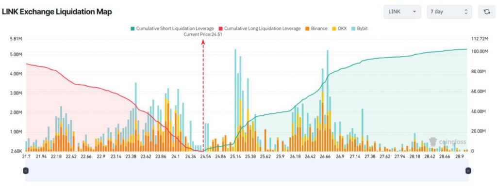 Chainlink (LINK)’s liquidation map looks balanced, with both bulls and bears having strong incentives. If Chainlink (LINK) falls below $22, around $85 million of long positions could be liquidated. If Chainlink (LINK) rises to $27, around $85 million of short positions will face liquidation. The price range and liquidation volume are almost identical, while the market sentiment remains greedy.