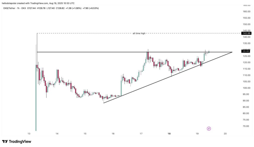 Analysis from AMBCrypto shows that OKB is trading within a bullish triangle pattern, which is formed from horizontal resistance levels and diagonal support lines. Currently, OKB is testing the upper resistance. If it manages to pass this level, OKB has the potential to surge to a new record high, exceeding the $142 mark.