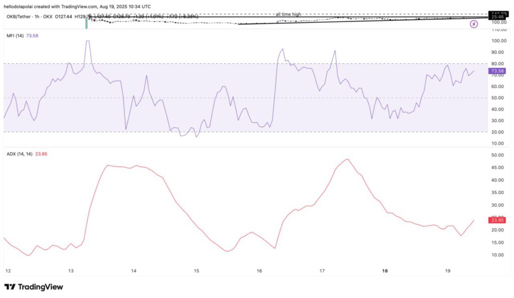 Technical indicators support a bullish scenario for OKB. The Money Flow Index (MFI) shows that the inflow of liquidity is still ongoing. Currently, the MFI is at one of its highest levels at 73.58, signaling strong buying activity and investors are not showing any signs of exiting the asset.