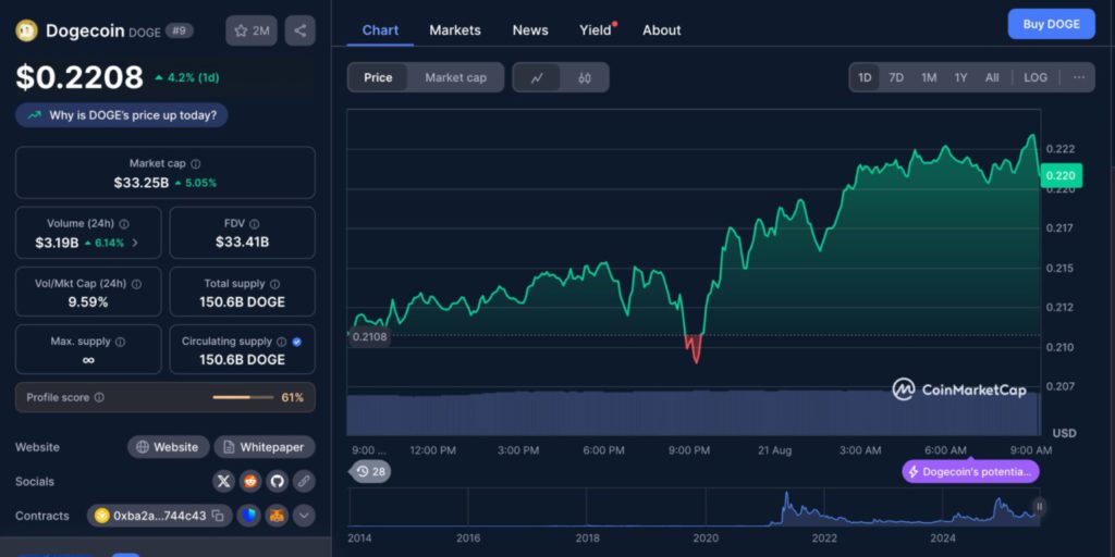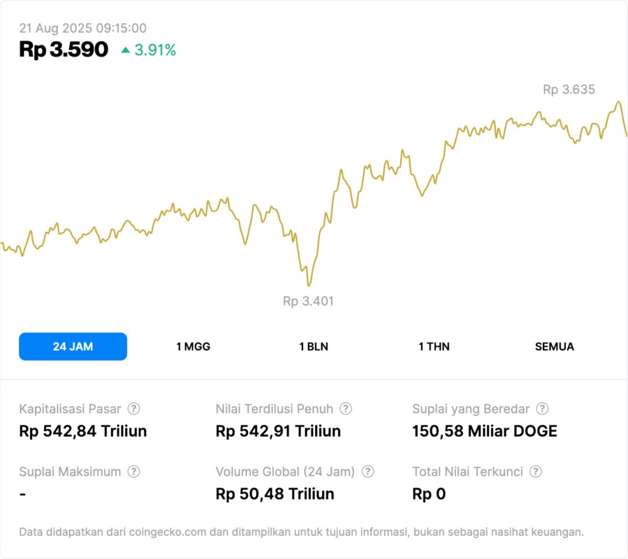 Jakarta, Pintu News – Dogecoin (DOGE), one of the most popular meme coins in the world, is showing positive performance again. Based on CoinGecko data as of August 21, 2025, the price of DOGE rose 3.91% to Rp3,590 per coin. Meanwhile, CoinMarketCap recorded the DOGE price at $0.2208 or around Rp3,593 with a market capitalization of $33.25 billion or around Rp542.8 trillion.