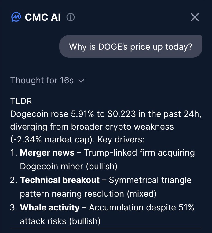 This increase occurred amid the overall crypto market weakness of -2.34%. CMC AI analysis said there were three main factors driving DOGE’s price movement, namely company mergers, technical breakouts, and whale accumulation.
