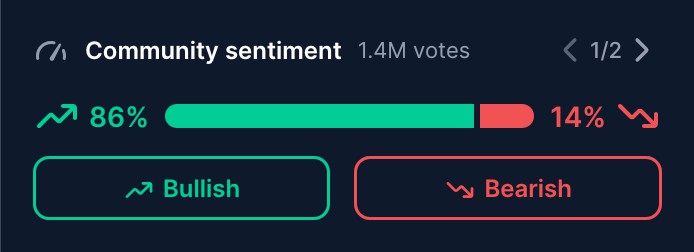 CoinMarketCap’s community sentiment data also showed 86% of the 1.4 million community votes were bullish on DOGE. Only 14% predicted bearishness, reflecting the market’s optimism towards Dogecoin’s future.