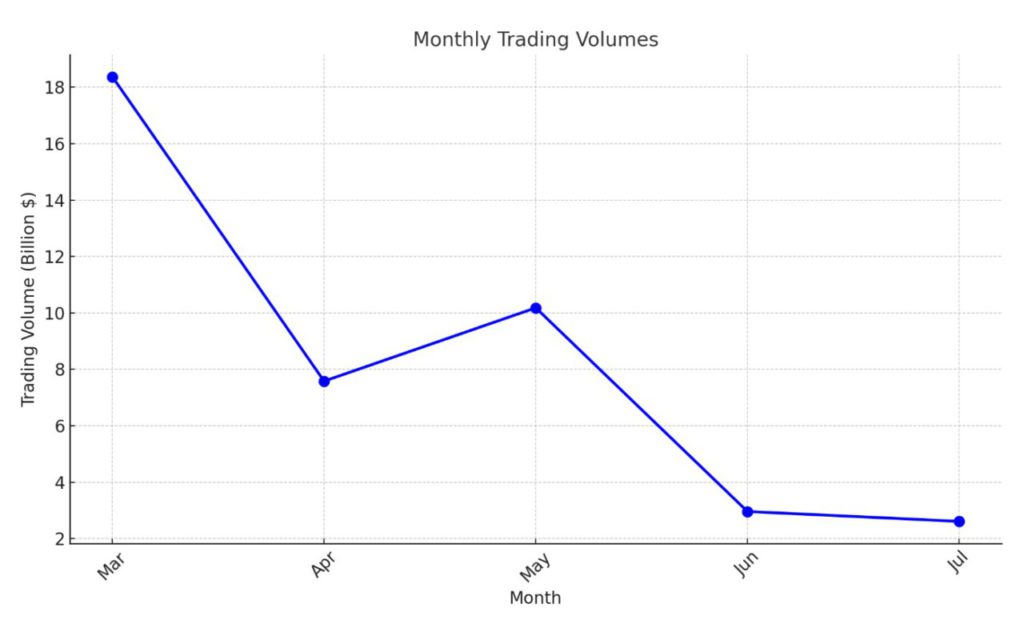 From $18 billion in March, it dropped to just $2.6 billion in July, representing a decline of 85%. This decline reflects reduced investor interest in Pi Coin.