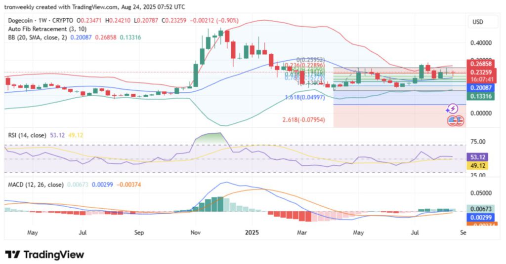 Pada 24 Agustus, DOGE bergerak di sekitar garis tengah Bollinger Bands dengan support utama di $0,2008 dan resistance di $0,2595, yang kemungkinan besar akan menentukan arah pergerakan berikutnya.