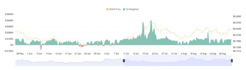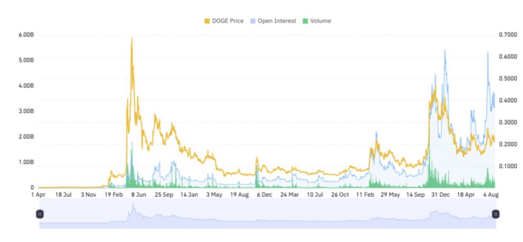 Per 24 Agustus, DOGE sempat diperdagangkan di level $0,2330 dengan volume transaksi harian sebesar $1,78 miliar, turun 66,49%. Kapitalisasi pasarnya tercatat sebesar $35,08 miliar, mengalami penurunan 1,87%.