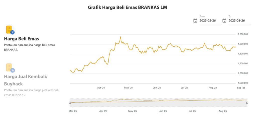 BRANKAS LMâs gold purchase price chart data from February 26 to August 26, 2025 shows a significant upward trend, especially in the April to May 2025 period. This graph shows that the price of gold had jumped close to IDR 2,000,000 per gram in May before experiencing a correction.