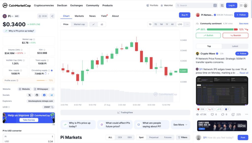 The chart above shows the price movement of Pi Network (PI) on CoinMarketCap over the last 24 hours. The PI price started at around $0.3390, then fluctuated with a slight increase until it reached $0.3440, before dropping back down to around $0.3400.