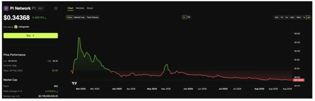 Real-time data shows that the PI price was briefly trading around $0.34-just slightly above the all-time low of $0.3312 (August 26, 2025). This slight gap could easily be broken if bearish sentiment strengthens.