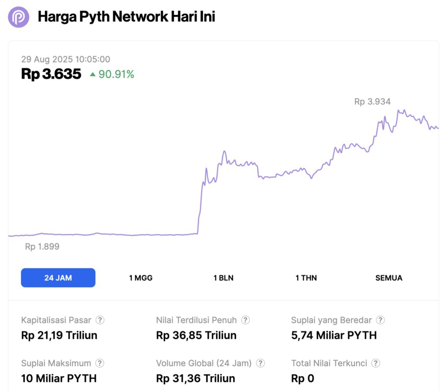 Jakarta, Pintu News – The Pyth Network token price skyrocketed more than 90% within 24 hours as of August 29, 2025 after the project was announced as one of the official data providers by the United States Department of Commerce.