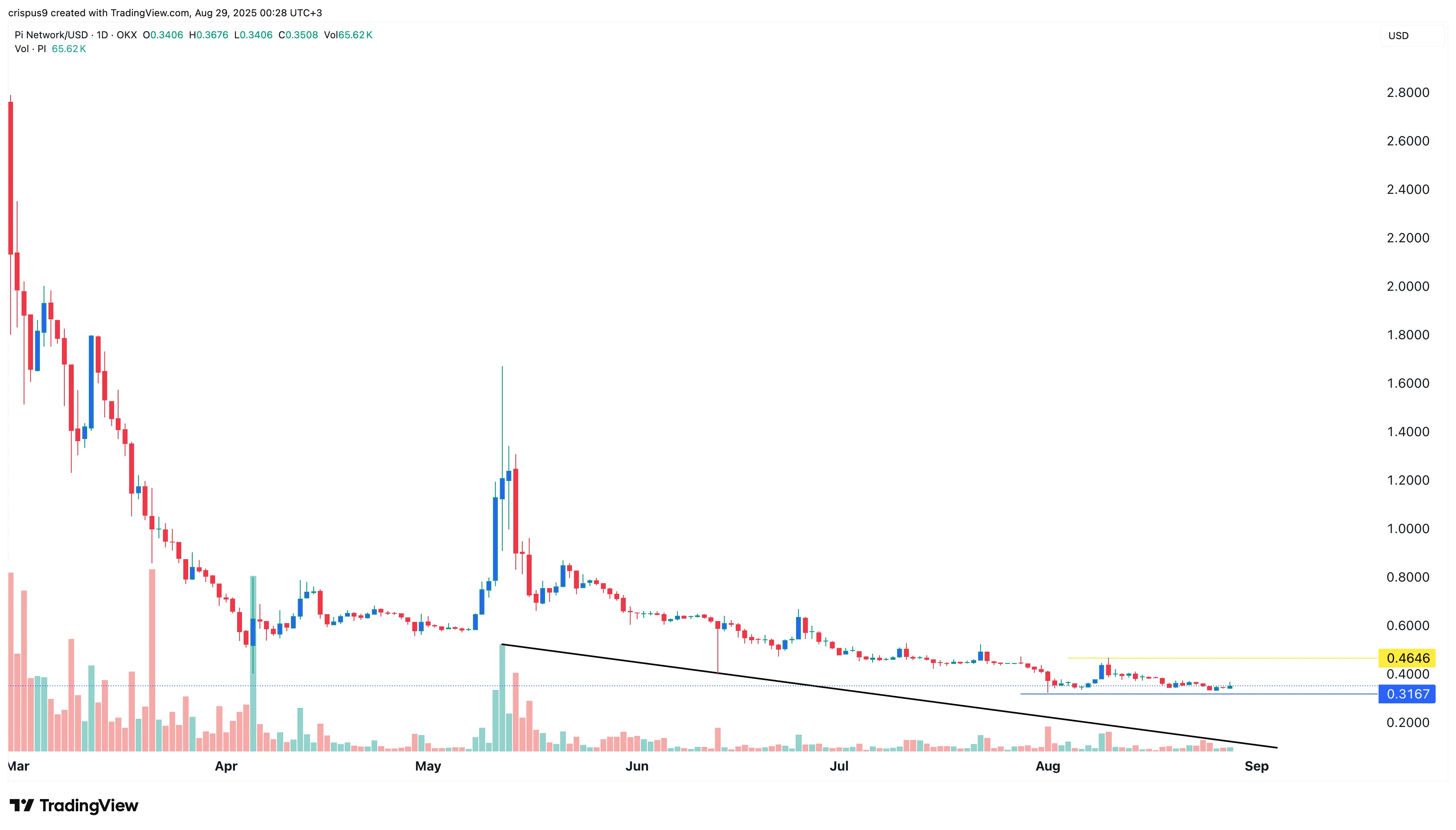 In recent months, the price of Pi Network (PI) has been moving in a relatively narrow range. This phenomenon is referred to as an accumulation phase in Wyckoff’s theory, where prices move sideways with volumes tending to decrease. Pi’s trading volume has also been seen steadily decreasing since May 2025, reflecting low short-term speculative interest.