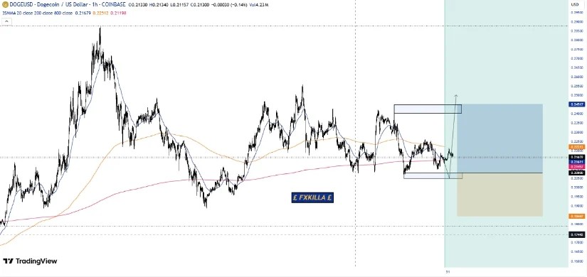 From a technical perspective, the Dogecoin (DOGE) chart shows consolidation between $0.21 and $0.23. This narrow trading range often signals a compression phase before a decisive breakout.