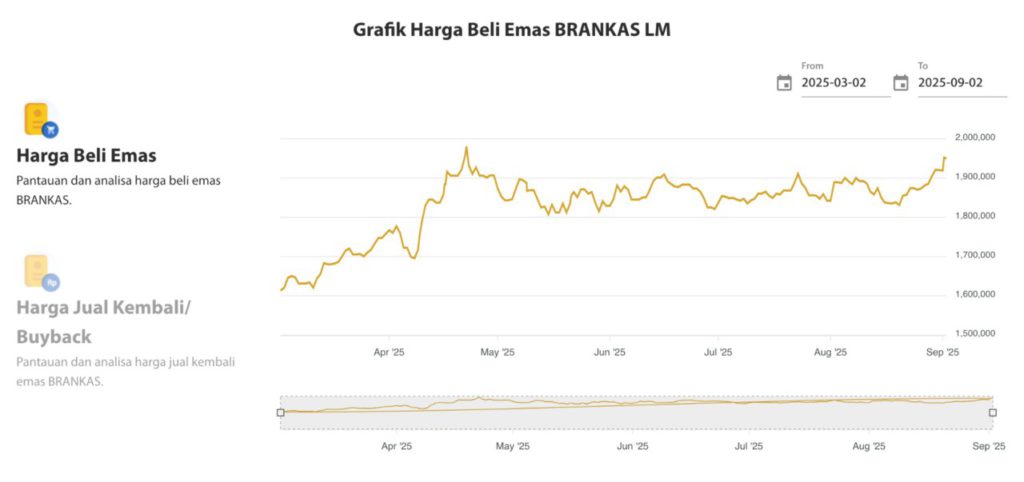 Through the BRANKAS LM gold price chart from March 2 to September 2, 2025, it can be seen that the price of gold touched a high of close to Rp 2,000,000 per gram in May 2025. After that, the price experienced a correction and tended to stabilize in the range of IDR 1,850,000 to IDR 1,950,000.