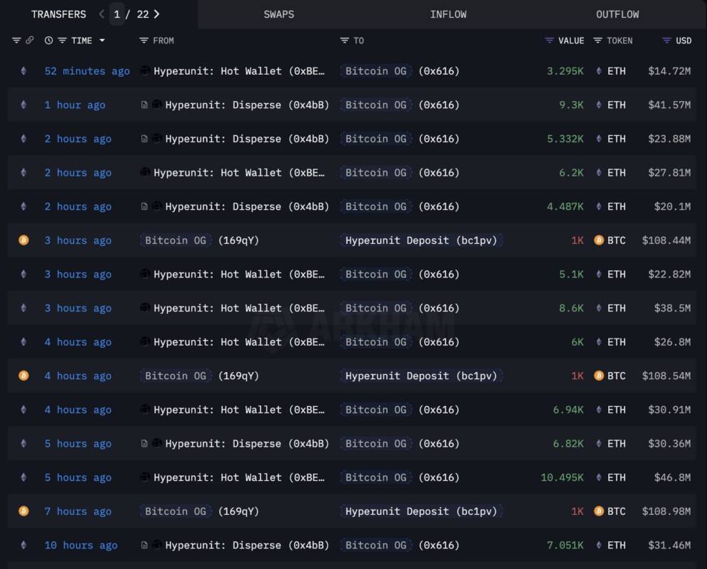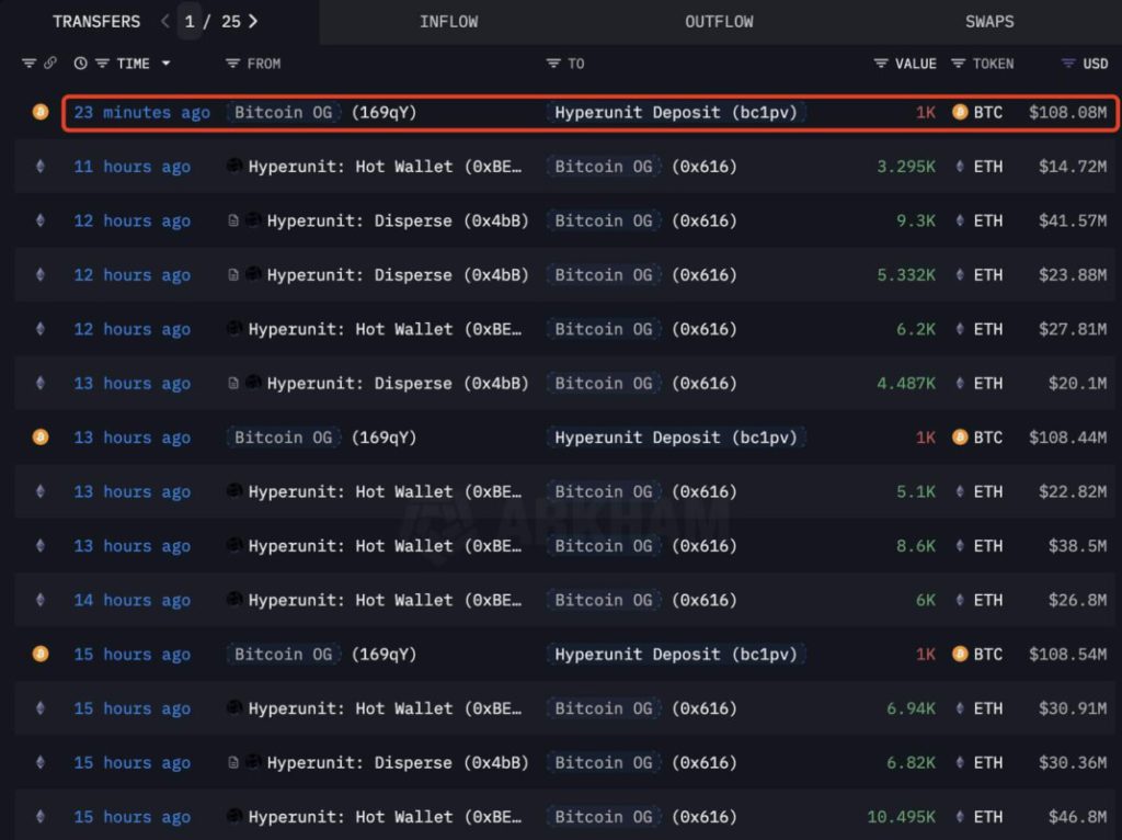 The Bitcoin whale known as “Bitcoin OG” has started a massive migration from Bitcoin (BTC) to Ethereum (ETH) since last August. In just 12 hours, the whale sold 4,000 BTC worth about $435 million to buy 96,859 ETH. This move not only increased the amount of ETH owned by the whale to $3.8 billion, but also placed him as one of the largest Ethereum holders in the market.