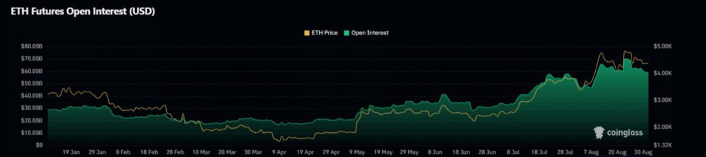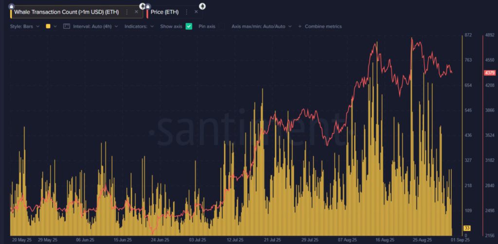 During August, there was a significant increase in the number of large transactions on Ethereum, with transactions of over $1 million peaking. This coincided with a rise in the price of ETH, which broke through the $4,300 mark. These large players in the market were not only active in repositioning assets, but also adding momentum to Ethereum’s price movement.