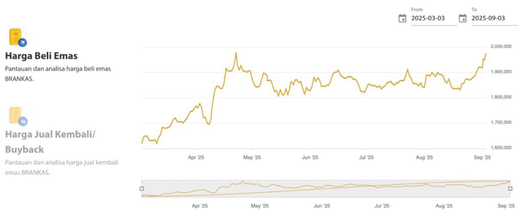 Jakarta, Pintu News – Gold prices continue to be a concern for many investors, especially amid uncertain economic conditions. Today, September 3, 2025, Antam’s gold price experienced a slight increase, recording a physical gold purchase price of IDR 2,035,000 per gram and a corporate BRANKAS gold purchase price of IDR 1,975,600 per gram.