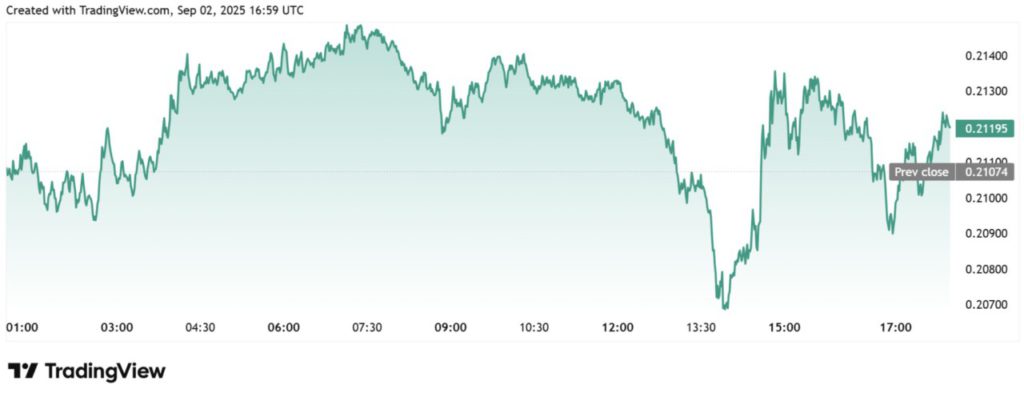 Dogecoin price is trading flat amid the emergence of this latest reserve company. TradingView data shows that the biggest meme coin is currently trading around $0.21, up less than 1% on September 2.