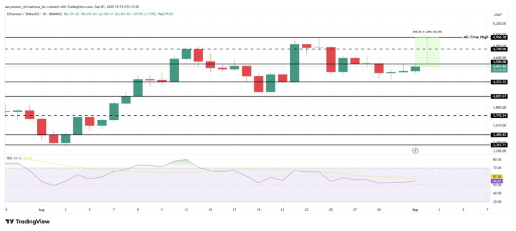 Ethereum is one of the closest altcoins to retesting its all-time high. Trading at $4,461, the altcoin leader is just 11% away from reaching its previous peak of $4,956.