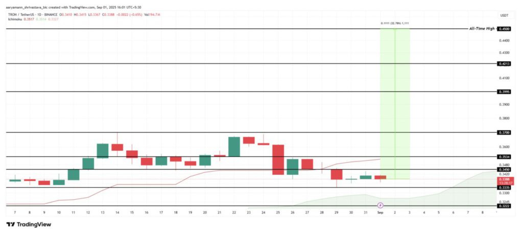 If momentum dissipates, TRX is at risk of falling. A drop below the $0.33 support could push the token lower, with a target at $0.32 or even weaker levels. Such a move would reduce the likelihood of TRX forming a new ATH this month.