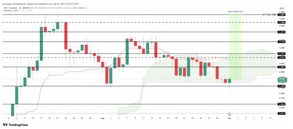 In early September 2025, XRP briefly traded at $2.81, maintaining support above $2.74 at the time of writing. The altcoin’s ability to move towards an all-time high is highly dependent on investor sentiment.