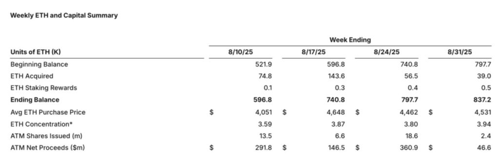 SharpLink, a Minnesota-based company, purchased 39,008 ETH between August 25 and August 31 at an average price of $4,531. These purchases were partially financed through an at-the-market (ATM) equity program that raised $46.6 million.