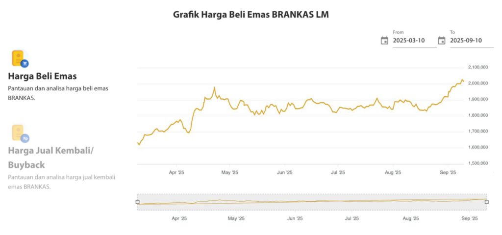 Judging from the BRANKAS LM gold purchase price chart displayed on the official BRANKAS dashboard, the gold price trend has fluctuated over the past 6 months. In early March 2025, the price of gold was in the range of Rp1,550,000 – Rp1,600,000 per gram, and continued to rise gradually.