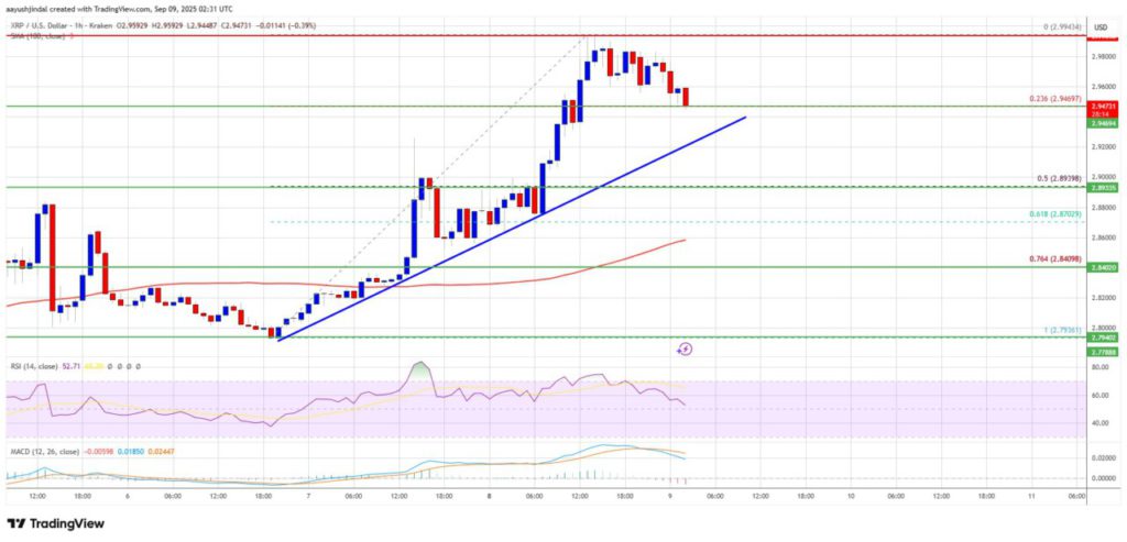 Ripple (XRP) has shown a strong performance by holding above the $2,850 level and starting a new leg up. The price managed to break the $2,880 and $2,90 resistance, signaling a strong bullishness in the market. Market participants even managed to push the price past the $2,950 level, with the peak recorded at $2,994.