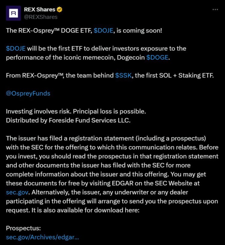 The REX-Osprey DOGE ETF, which will trade under the ticker $DOJE, marks a new era in Dogecoin (DOGE) history as the first cryptocurrency to have its own ETF. The ETF is designed to track the performance of Dogecoin (DOGE), providing an opportunity for investors to participate in the crypto market in a more structured and diversified way.