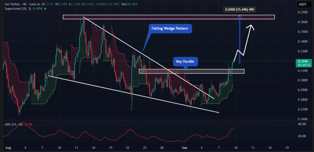 SEI recently broke out of a Falling Wedge pattern, a technical indicator often associated with a trend reversal from bearish to bullish. This breakout occurred after SEI crossed an important resistance at $0.31, which was previously considered a critical limit for further price increases.