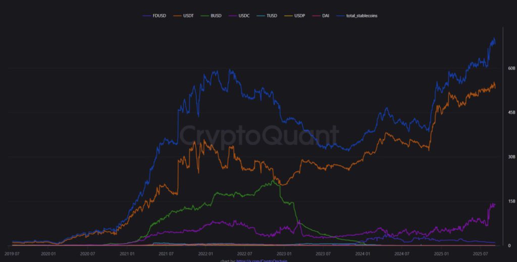 Jakarta, Pintu News – Stablecoin holdings on exchanges based on the Ethereum and Tron blockchains recently hit a record high totaling more than $70 billion. This marks a new high after the previous record in 2021 during the bull market, which stood at around $60 billion. After stabilizing at that figure for most of the year, the number of stablecoins on exchanges began to rise sharply in August.