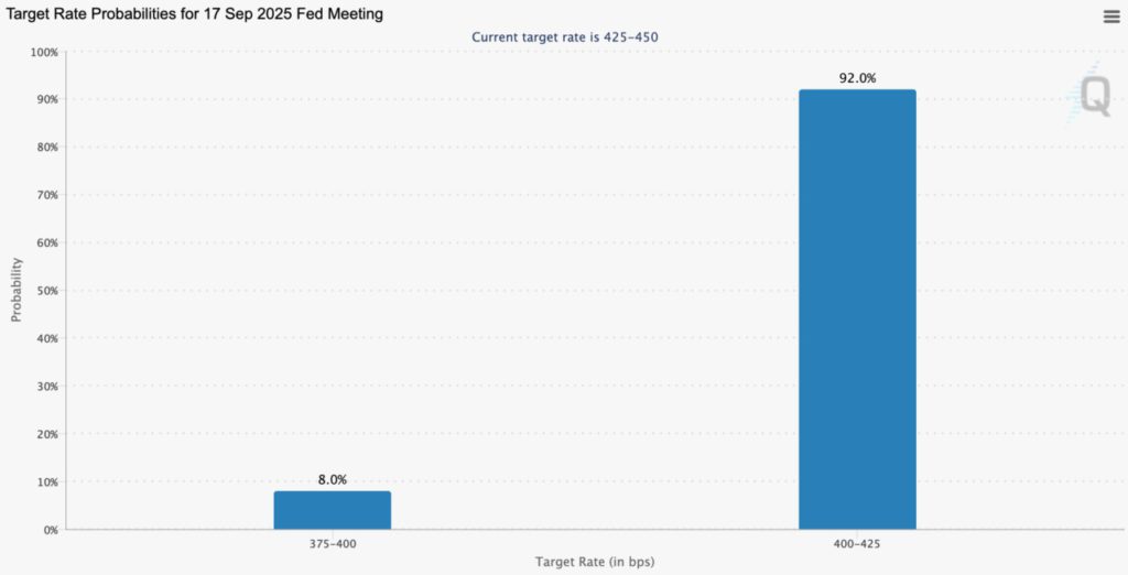 The CME FedWatch tool shows a 92% probability that the Fed will cut rates by 25 basis points next week. Meanwhile, the odds for a larger cut of 50 basis points stand at just 8%.