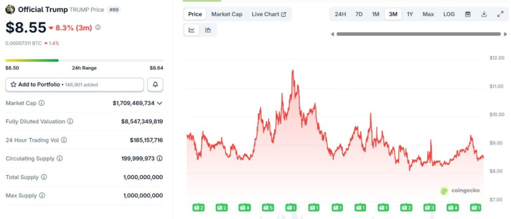 According to a report from CoinCentral, the TRUMP Coin meme token launched in January 2025 had reached a full valuation of $73 billion. But after the negative news released in late 2024, its value plummeted by 88%, down to $8.6 billion.