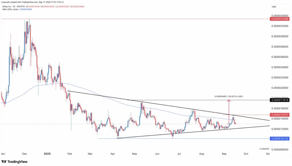 Pada grafik kerangka waktu harian (17/9), terlihat bahwa harga Shiba Inu mengalami penurunan minggu ini seiring para investor menantikan keputusan suku bunga dari Federal Reserve.