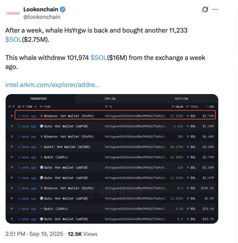Jakarta, Pintu News – As the weekend approached, the cryptocurrency market was once again enlivened by major whale maneuvers. LookOnChain data on September 19 recorded three notable transactions: a multimillion-dollar additional purchase of Solana , a large withdrawal of ASTER tokens from exchanges, as well as a massive sell-off of APX that resulted in significant gains.