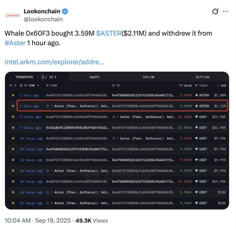 Whale with address 0x60F3 was recorded buying 3.59 million ASTER worth IDR 34.8 billion ($2.11 million) and withdrawing them from the Aster exchange within an hour. This quick move indicates an accumulation strategy, with the goal of keeping the assets in a private wallet instead of leaving them on the exchange. Such moves usually signal a long-term belief in ASTER’s price potential.
