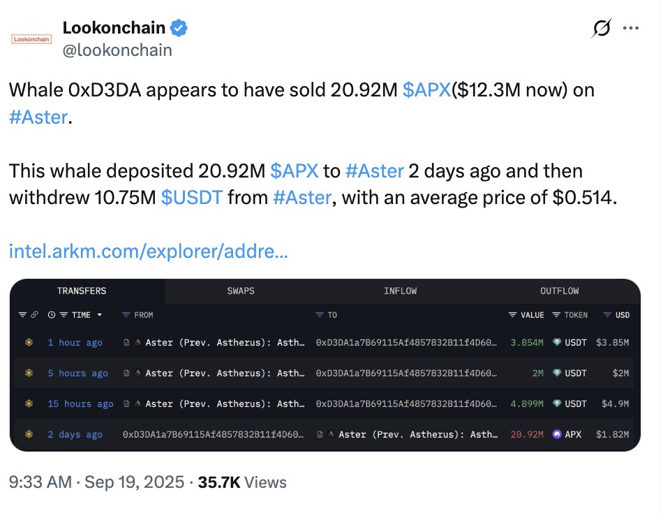20.92 Million APX Sold, Whale Earns Profit