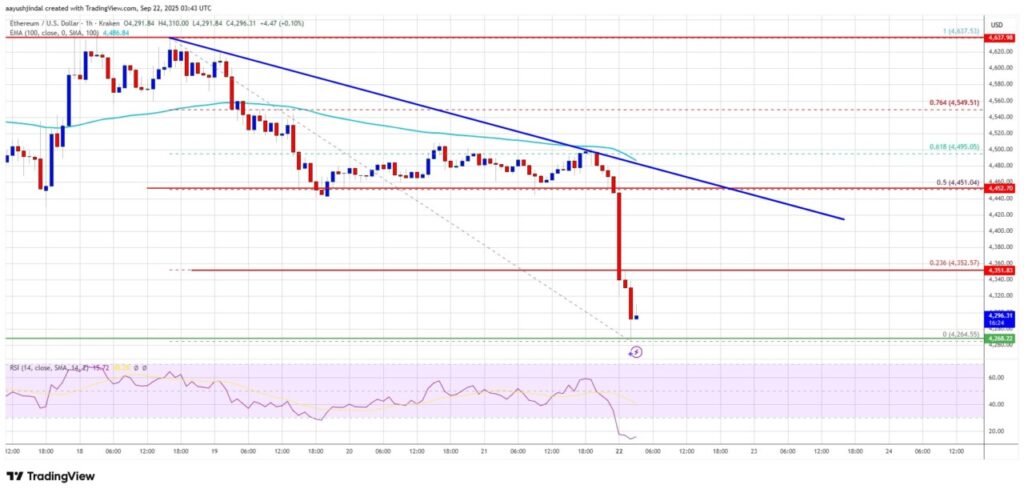 Ethereum briefly tried to extend its rally above $4,650, but failed and corrected sharply, breaking $4 ,600 and $4,550. The selling pressure continued until ETH formed a low at $4,264.