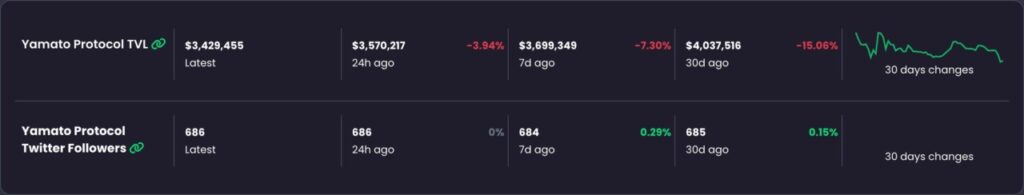 Despite the decline in TVL, the number of followers on social media such as Twitter showed steady growth. In the past 30 days, Yamato Protocol saw an increase in followers of 0.29%, indicating growing interest from the online community. This indicates that despite fluctuations in TVL values, interest in the protocol remains strong.