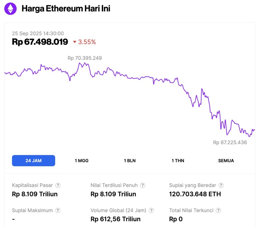On September 25, 2025, Ethereum’s price was recorded at approximately $4,013, or around IDR 67.49 million, marking a 3.55% decline over the past 24 hours. Within that period, ETH slipped to a daily low of IDR 67.23 million and reached as high as IDR 70.40 million.