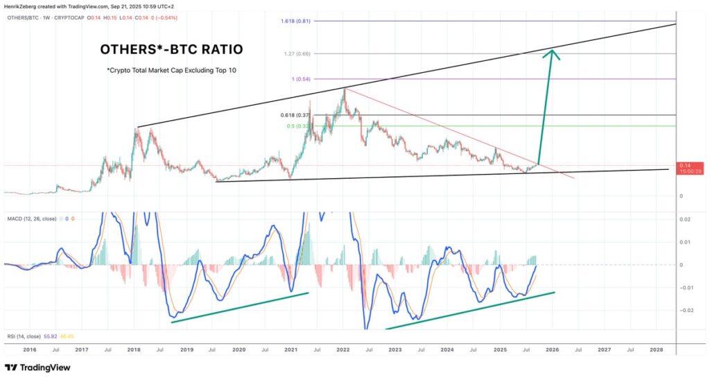 Henrik Zeberg, known for his incisive analysis, recently shared that the crypto market is far from its peak. Through his X account with 198,300 followers, Zeberg pointed out that the OTHERS chart, which tracks the market capitalization of all crypto assets except the 10 largest coins and stablecoins, is showing signs of a bullish recovery.