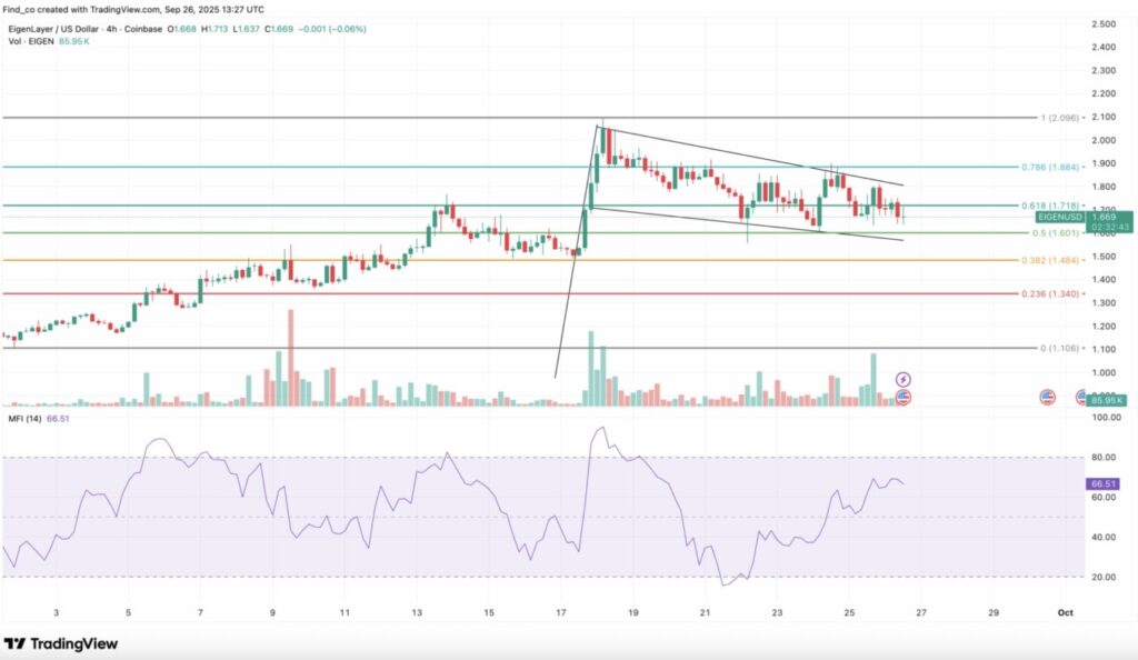 Supporting this view, the Money Flow Index (MFI) indicator rose to 66.55, signaling stronger buying pressure. If the momentum is maintained and EIGEN manages to break the upper trend line of the pattern, there is a chance of a rally towards $2.10.