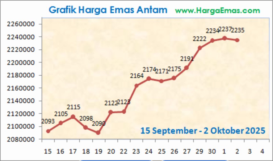 Jakarta, Pintu News – The price of gold, especially those produced by PT Aneka Tambang Tbk (Antam), is always in the spotlight for investors in Indonesia. In today’s trading, Thursday, October 2, 2025, the price of Antam gold for 1 gram denominations is recorded at an attractive level of around Rp2,237,000, based on data from one of the precious metal trading platforms.