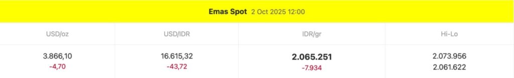 Gold prices in the global spot market showed a significant positive trend, becoming one of the main drivers of the increase in Antam gold prices in the domestic market. Based on the global commodity price report, spot gold was recorded at a level of around $3,864.20 per troy ounce on Thursday, October 2, 2025. This increase in world gold prices, according to commodity market analysis, is generally influenced by the increasing demand for safe haven assets amid global geopolitical uncertainty.